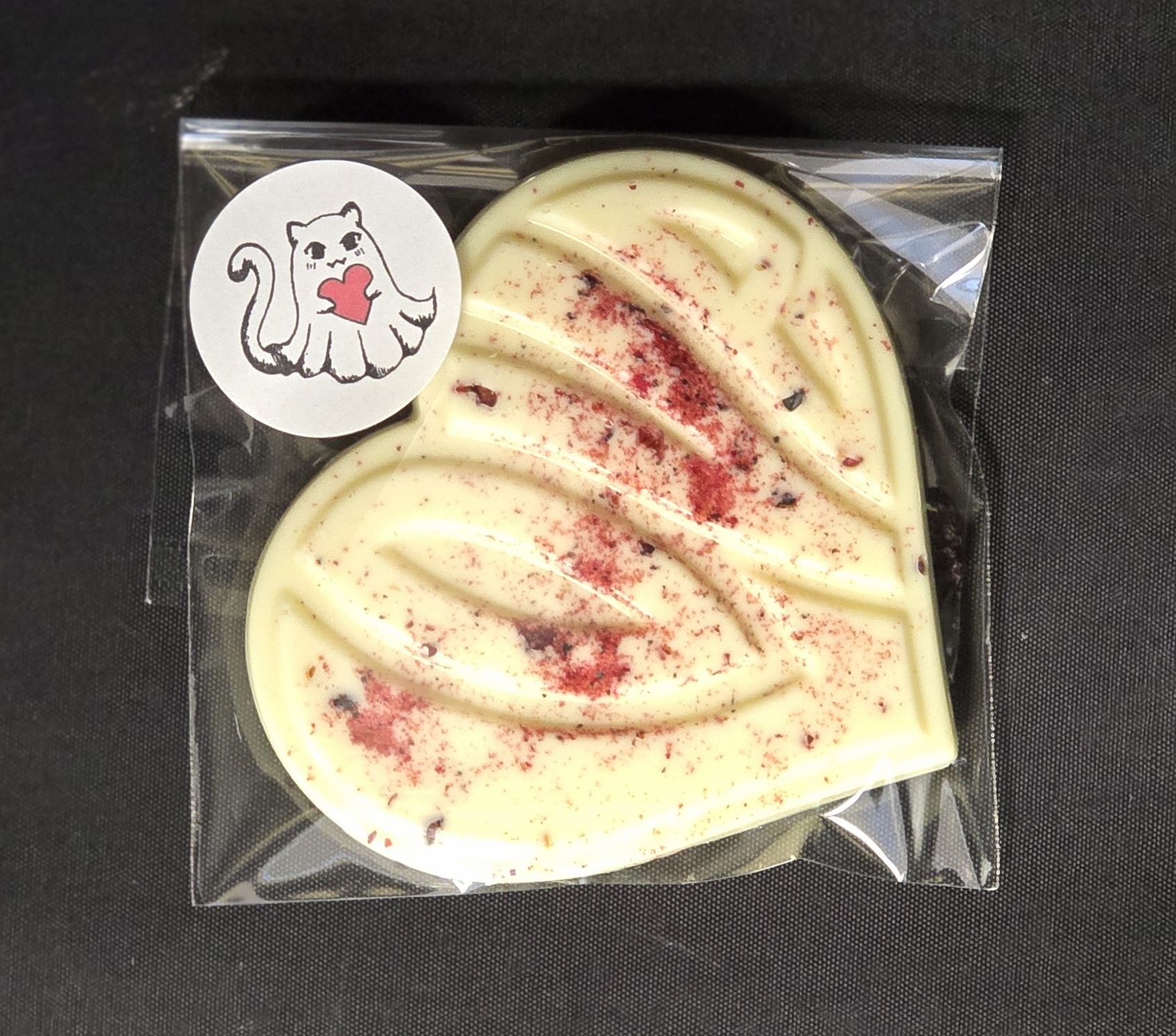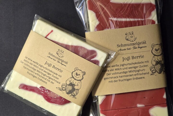 Cremige weiße Schokolade mit fruchtiger Kirsche und Pistazien.