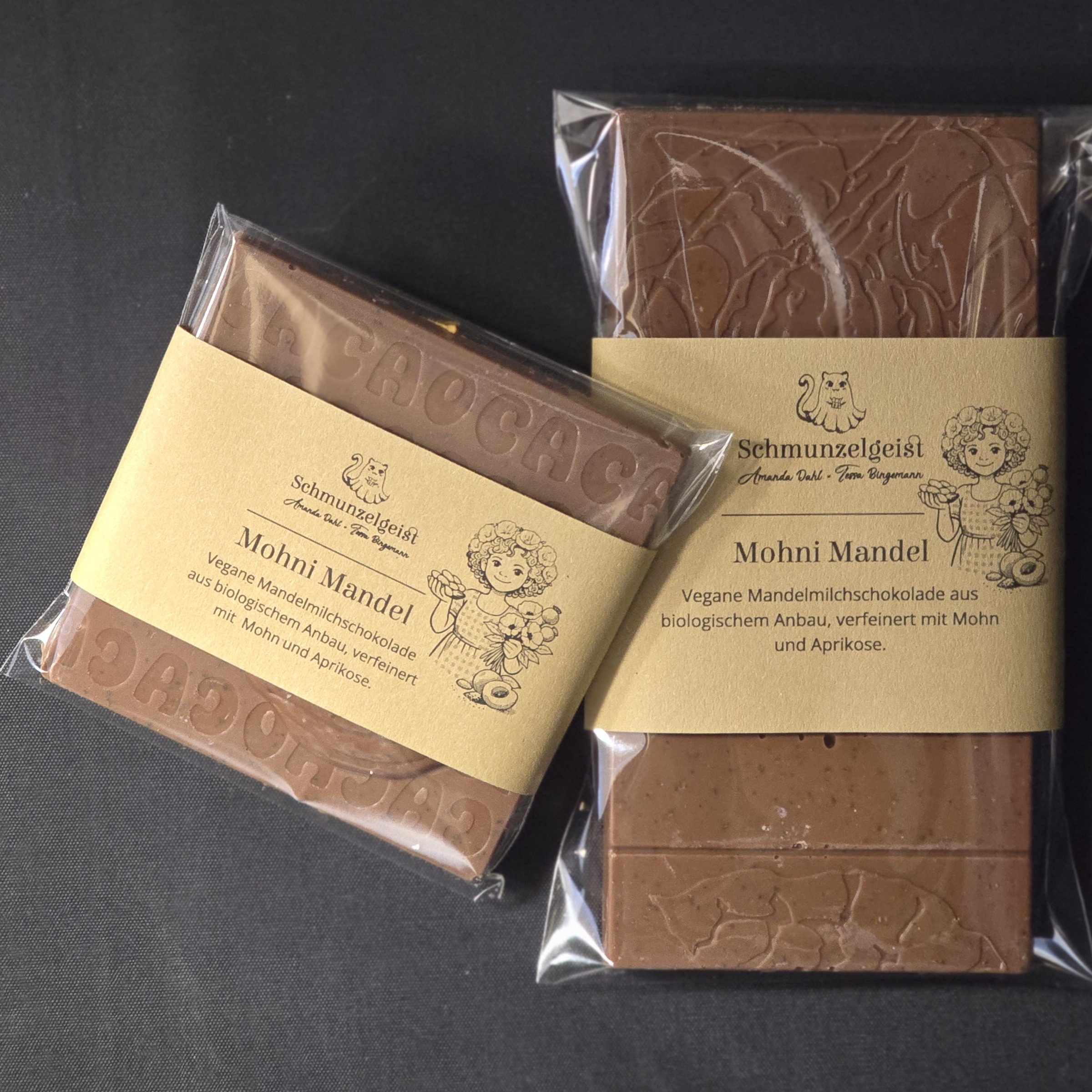 vegane Mandelmilchschokolade aus biologischem Anbau mit Mohn und Aprikose verfeinert